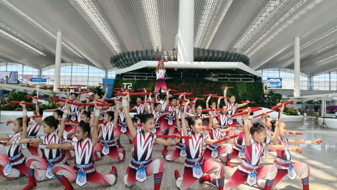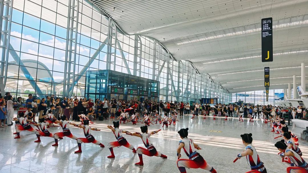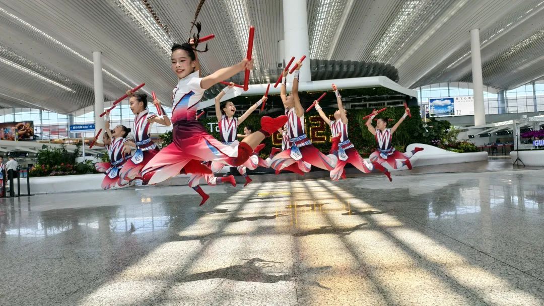 7月26日下午,伴随着热烈的鼓点响起,网红传统非遗表演英歌舞的“迷你版”在白云机场航站楼闪亮登场——这支特殊的英歌队伍刚在7月21号举行的"粤港澳大湾区青少年艺术总展演"获得金奖,平均年龄只有9岁,小小的身形迸发大大的能量,引来旅客掌声和欢呼连连。“白云机场把非遗项目带进旅途中,让孩子们更多接受到传统文化的熏陶,我觉得很有意义。”旅客陈先生说道。